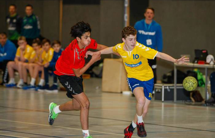 Nicht aufzuhalten: HSG-Spielmacher Andre Pitthan (rechts) hängt seinen Gegenspieler ab. Der Binger Torjäger war mit neun Treffern maßgeblich am Erfolg gegen Dudenhofen beteiligt. - Foto: WaidnerC-Jugend der HSG Rhein-Nahe feiert gegen Dudenhofen/Schifferstadt zweiten Saisonsieg